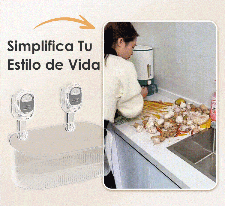 Ahora todos tus artículos están organizados en un estante al nivel perfecto, sin salpicaduras ni botellas por el suelo; puedes entrar y salir sin tropiezos.