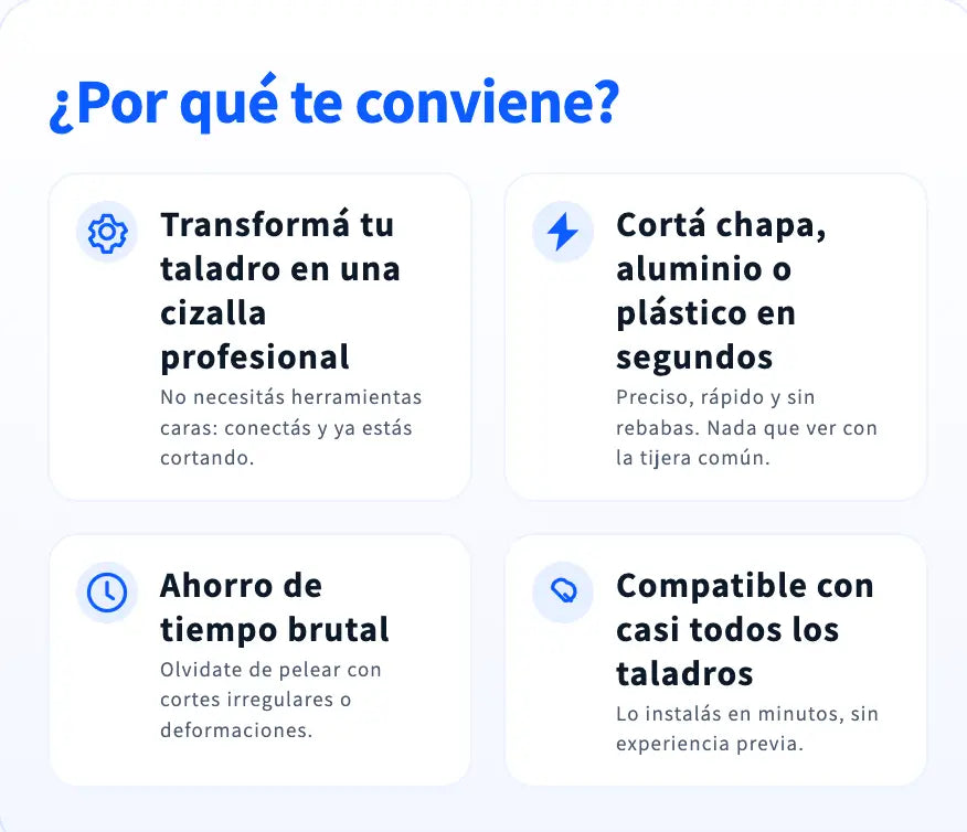 Con un solo adaptador: cortes prolijos en chapa, aluminio o plástico en segundos, sin rebabas y sin perder tiempo